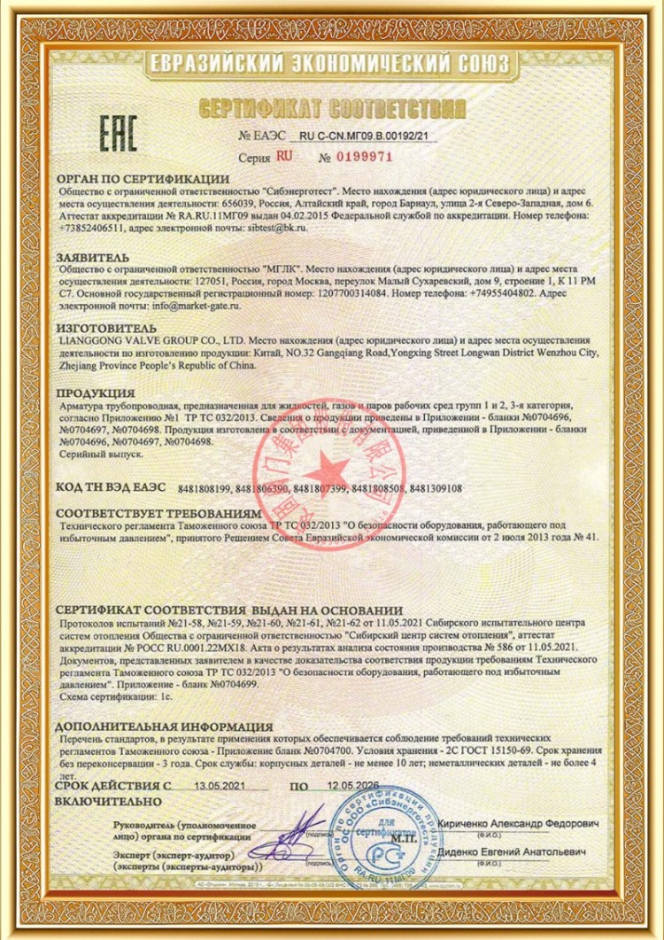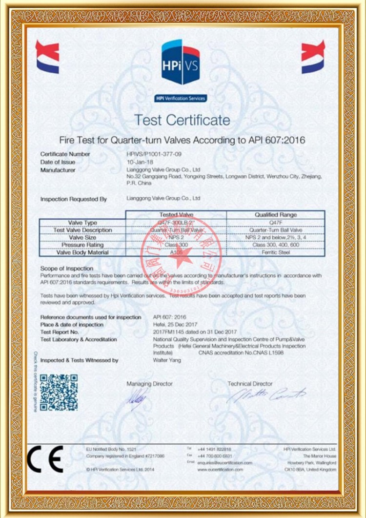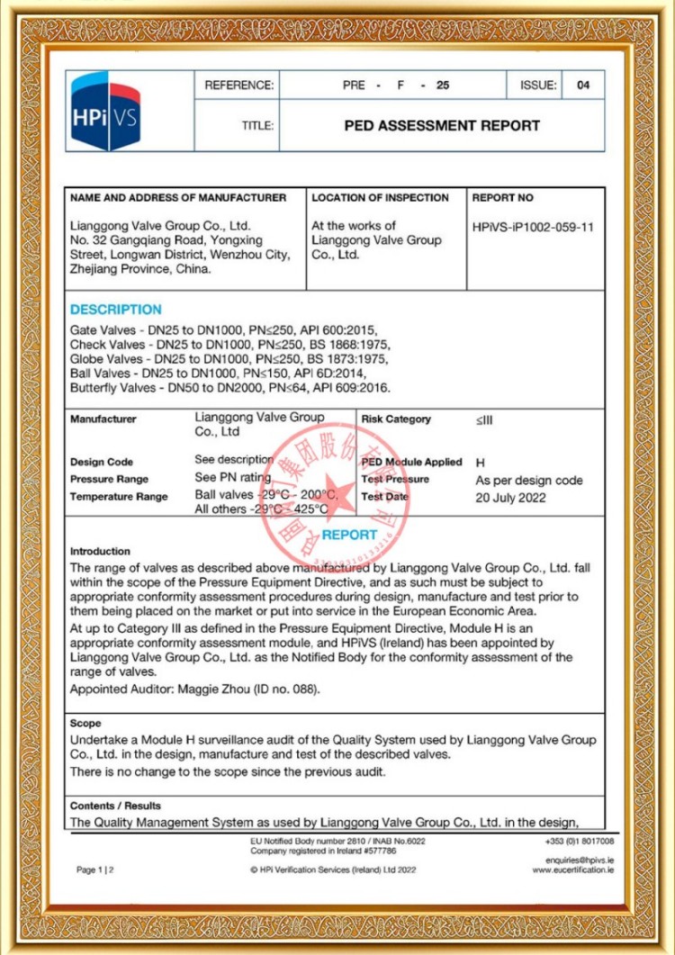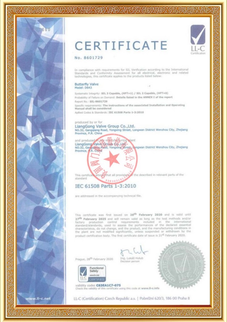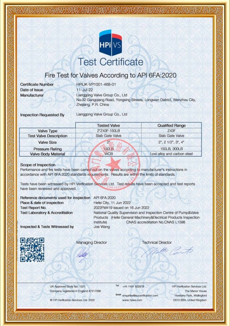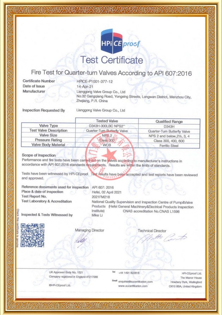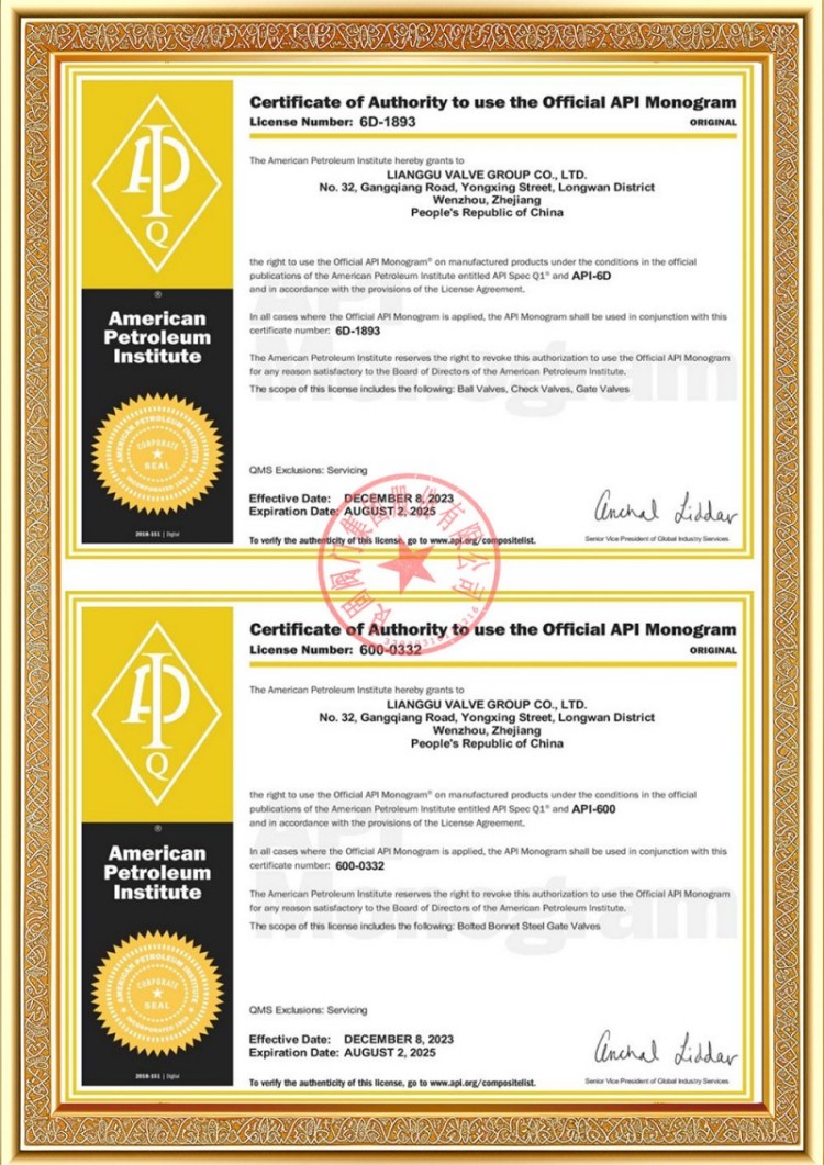 Η εταιρεία μας διαθέτει διάφορες άδειες παραγωγής βαλβίδων σωλήνων πίεσης και τα προϊόντα μας έχουν περάσει τα TS A1, ISO 9001, ISO 14001, ISO 45001, API 6D, API 600, APL 609, CE/PED, API 607, API 6FA, ISO 15848.-1 και σύστημα προϊόντων Ecert Διαθέτουμε επίσης πιστοποιητικά ευρεσιτεχνίας για διάφορες βαλβίδες όπως σφαιρικές βαλβίδες, βαλβίδες πεταλούδας, βαλβίδες ασφαλείας και βαλβίδες διακοπής.
